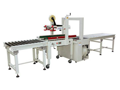 封箱機(jī)(紙箱膠帶封口)+高解析噴碼機(jī)(日期、批號、廠名等信息噴印打碼設(shè)備)+自動(dòng)打包機(jī)(自動(dòng)打出兩道PP帶。進(jìn)行紙箱捆扎包裝)