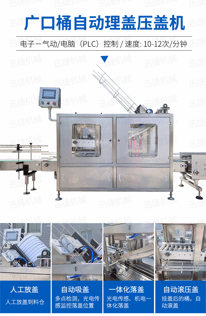 自動(dòng)理蓋壓蓋機(jī)可以完成自動(dòng)完成理蓋、壓蓋、輸送進(jìn)瓶、輸送出瓶等一系列操作,設(shè)備采用機(jī)械式原理,電機(jī)驅(qū)動(dòng),具有工作穩(wěn)定可靠,操作簡便,生產(chǎn)效率高,適用范圍廣等特點(diǎn)。廣泛應(yīng)用于各種規(guī)則的玻璃、塑料材質(zhì)的圓瓶、方瓶的壓蓋,是日化、化妝品、醫(yī)藥、食品等行業(yè)的理想壓蓋設(shè)備。