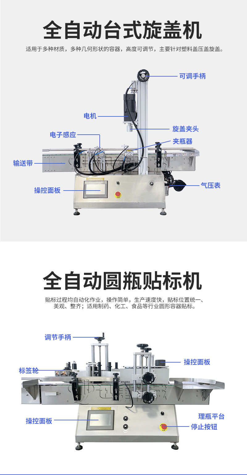 本設(shè)備主要適用于食品、日常化工、農(nóng)藥、醫(yī)藥和特殊行業(yè)。灌裝精度將受氣壓的穩(wěn)定性、物料的均勻性、灌裝速度等的影響。 產(chǎn)品說明:生產(chǎn)線根據(jù)灌裝范圍選擇型號,灌裝部分為雙頭下潛式灌裝機,適用于不同物料不同瓶子的灌裝,配備自動壓蓋機和圓瓶貼標機,可實現(xiàn)不同蓋子的旋蓋貼標工作。