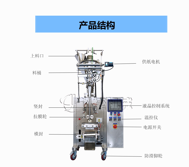 小袋系列立式間隙式包裝機,可完成三邊封、四邊封、背封、異 形狀袋形,可對顆粒狀,粉末狀,液體/膏體狀物料進行定量包裝 (備注:三邊封,背封機型不一樣;顆粒,粉末,液體/膏體計量方 式不一樣,不能通用)